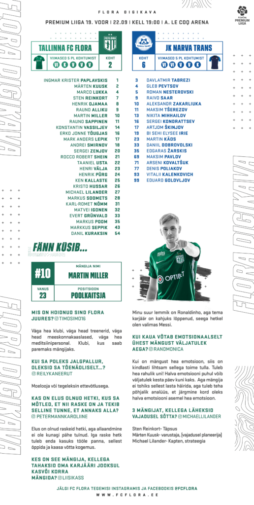 Põhapäeval varumeeste hulgast alustanud Rauno Sappinen sekkus 66. minutil, kui seis oli juba 2-0 meie kasuks. Mõlemad väravad lõi Rauno Alliku, kes ületas 100 värava marginaali Premium liigas. Kas mängu alustab heas hoos Rauno Alliku või Rauno Sappinen või hoopiski mõlemad? Marco Lukka mängis parem keskkaitsjana ning Kuusk oli vasakpoolne. Kas mängule minnakse sama keskkaitse paariga või saab oma võimaluse ka Erko Jonne Tõugjas? Seda kõike saad Sa näha juba homme kell 19:00 A. Le Coq Arenal või Soccernet.ee otseülekande vahendusel!